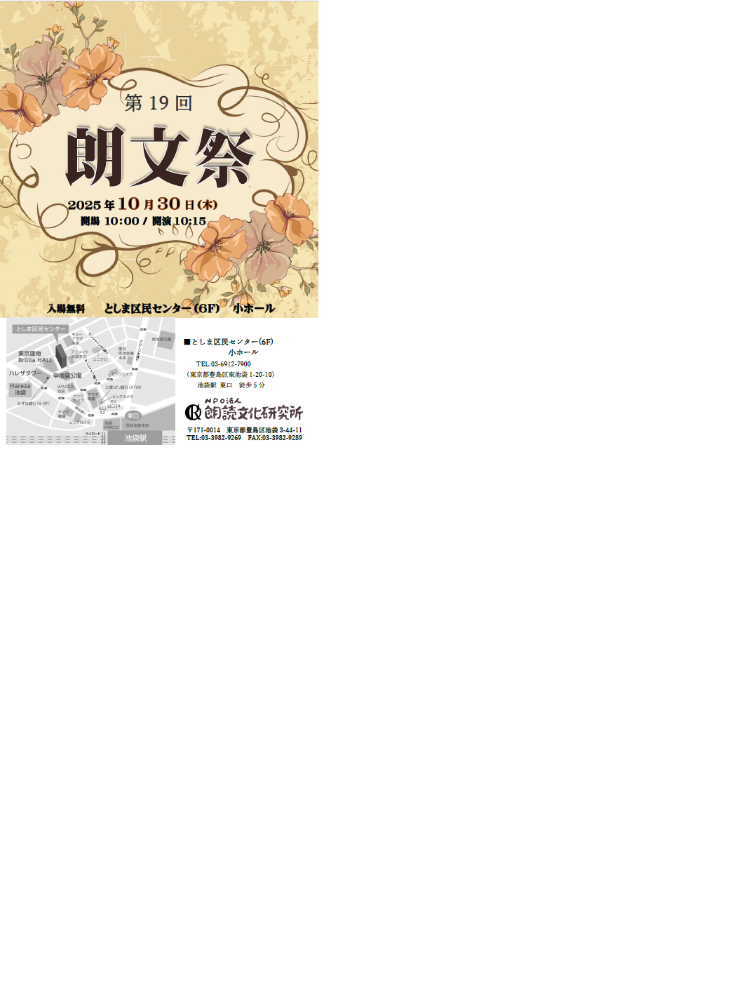 第19回 朗文祭 イベント情報 2025.10.21 今年度は初夏に続いて秋の開催となります。会員の皆様が「朗文祭」を楽しみに思って下さることにより、こうして回を重ねることが出来ます。 毎日の生活に寄り添う朗読で心の温まる時間をご一緒にお楽しみください。 皆様のご来場をお待ちしております。