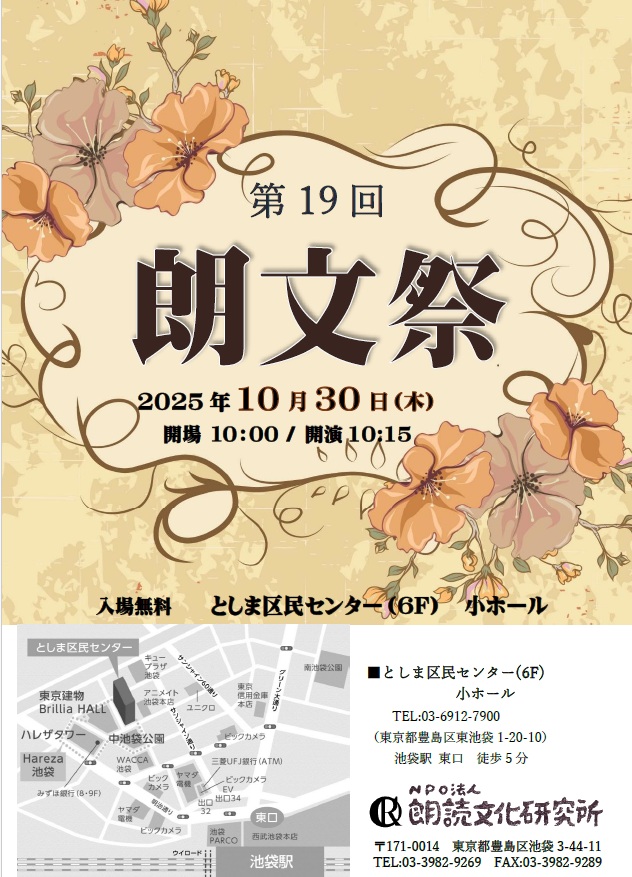第19回 朗文祭 イベント情報 2025.10.23 今年は初夏に続いて秋の開催となります。会員の皆様が「朗文祭」を楽しみに思って下さることにより、こうして回を重ねることが出来ます。毎日の生活に寄り添う朗読で心の温まる時間をご一緒にお楽しみください。 皆様のご来場をお待ちしております。